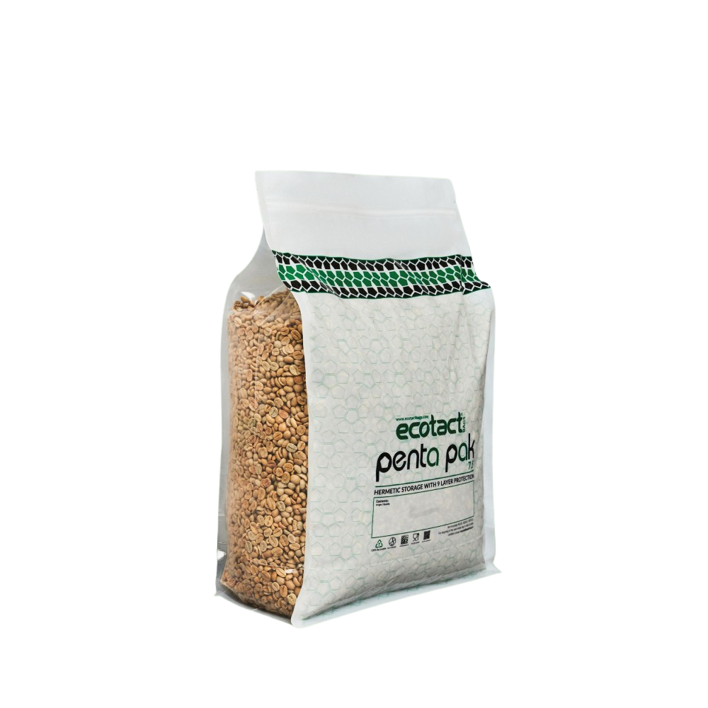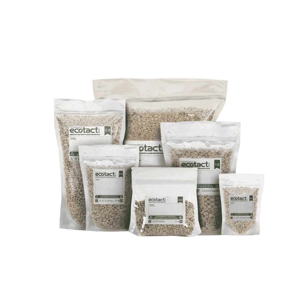 Ecotact bags are designed to lock in freshness and keep out moisture and oxygen—two of the biggest causes of ageing in green coffee. Their nine-layers of high-barrier recyclable film forms a strong barrier, helping preserve flavour, aroma, and structure over time. Heat sealable and resealable with a zipper, they’re built for storage and transport. Whether you’re roasting at home or managing green in bulk, Ecotact bags offer a reliable way to keep coffee stable for longe