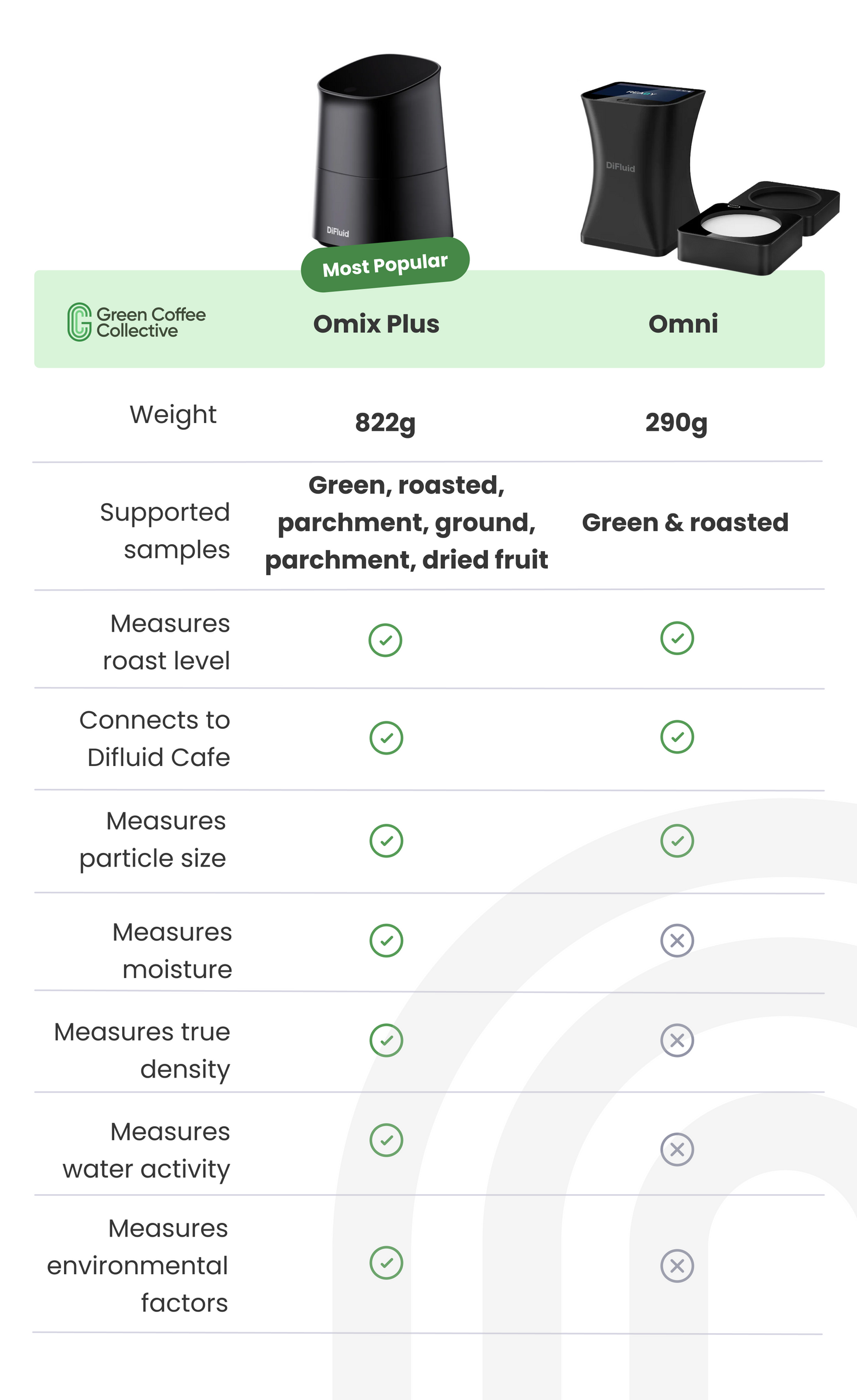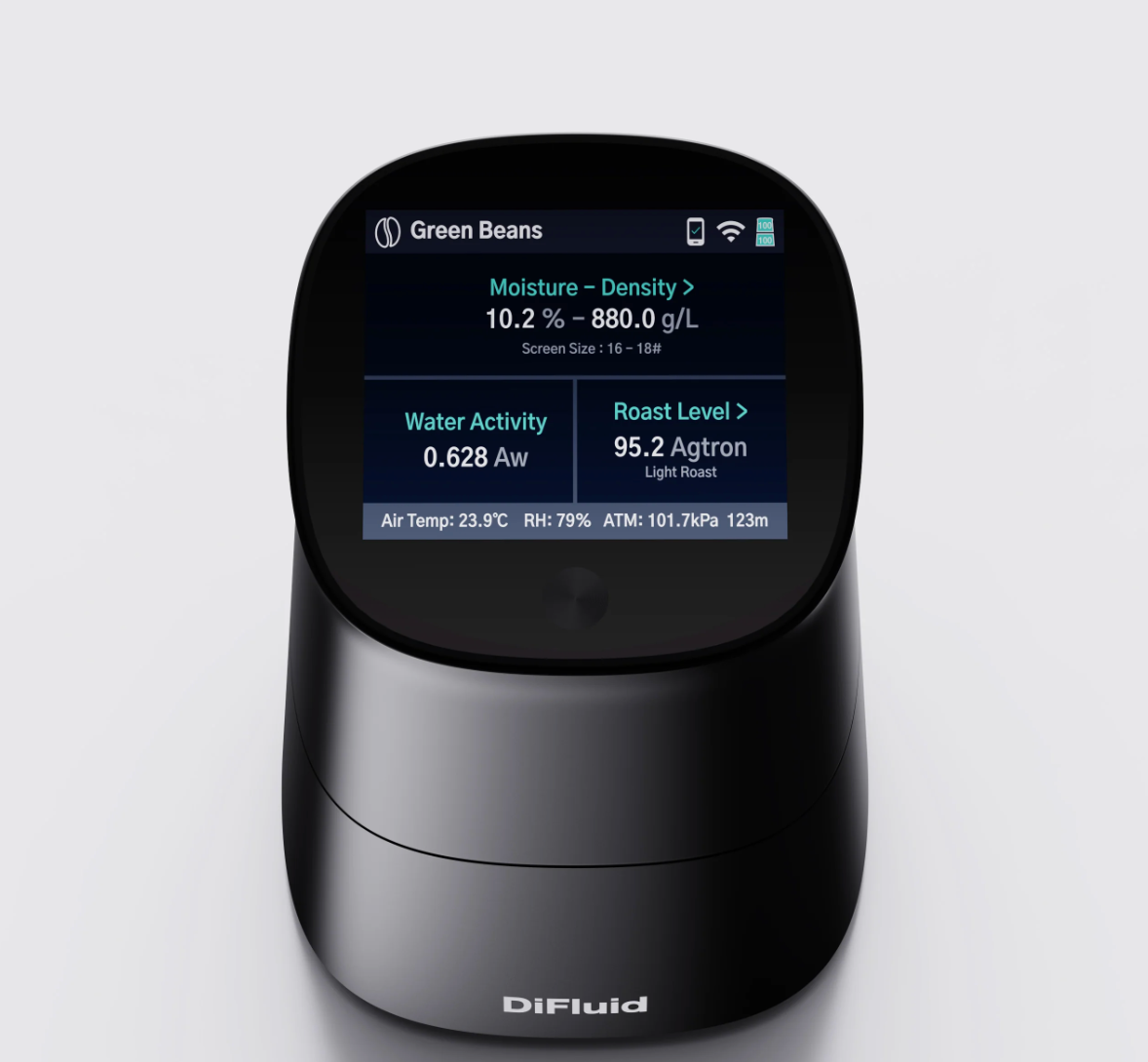 The DiFluid Omix Plus is a compact, all-in-one coffee analysis tool built to give you accurate, lab-level data - anywhere you need it. With just one device, you can measure water activity, moisture content, density, and roast level, along with environmental factors like temperature, humidity, and air pressure.