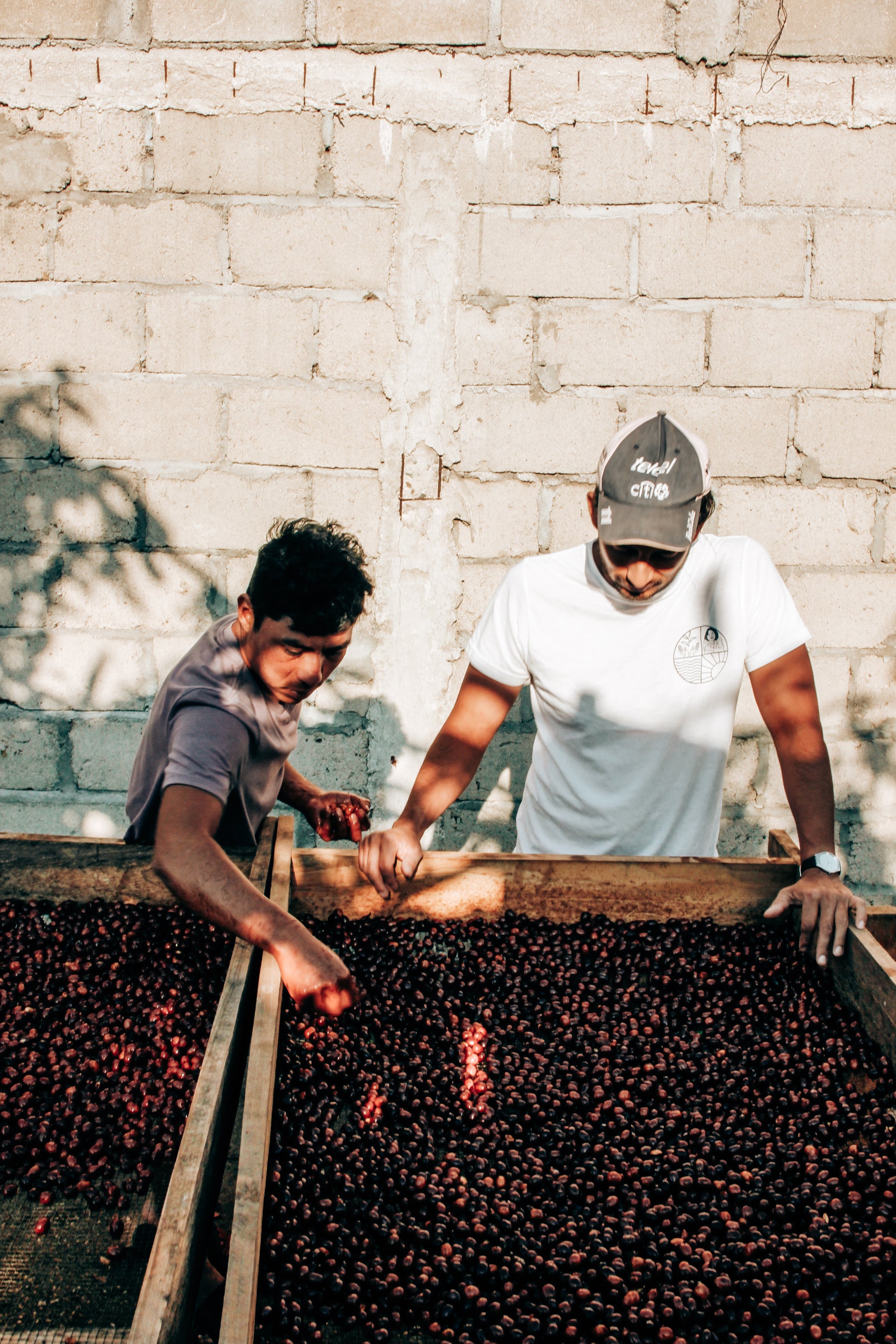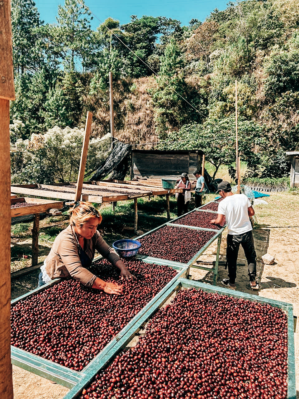 Harvest is tightly coordinated. Edelmira’s field technicians monitor cherry ripeness throughout the season, and once the fruit reaches peak maturity at around 23° Brix, the Sanchez family carries out a focused three-day harvest. Each evening, cherries are taken to Beneficio Edelmira, where they are floated, cleaned and sealed in GrainPro bags. The cherries rest anaerobically for 36 hours at around 25°C before drying slowly on raised beds under partial shade. Drying takes around 20 days, with daily checks on temperature and moisture. Once the coffee reaches 11% moisture, it is sealed in GrainPro bags for a 60-day stabilisation period before transport to the dry mill.